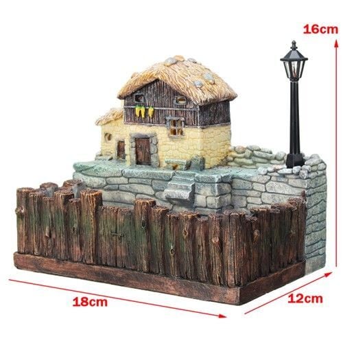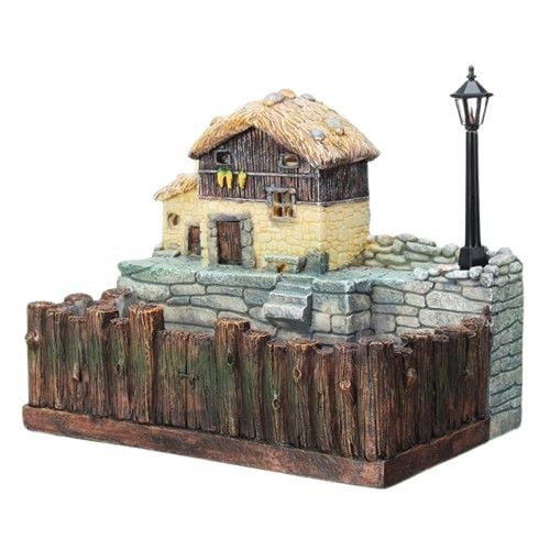 石積みのテラスや木造の家、街灯まで細かく作り込まれた立体デザインで、