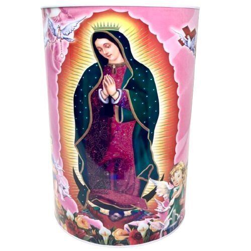 聖母グアダルーペが描かれた、円筒型のメタル製コインバンクです。